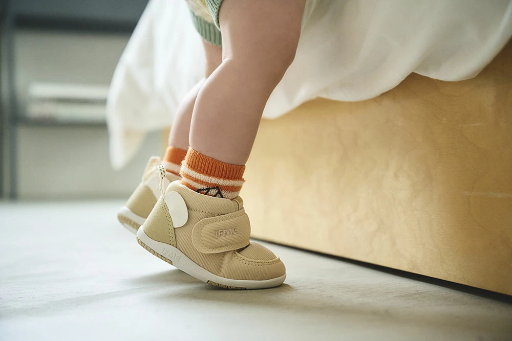 足首を支えるミドルカット仕様で、不安定な赤ちゃんの歩行を支えます。