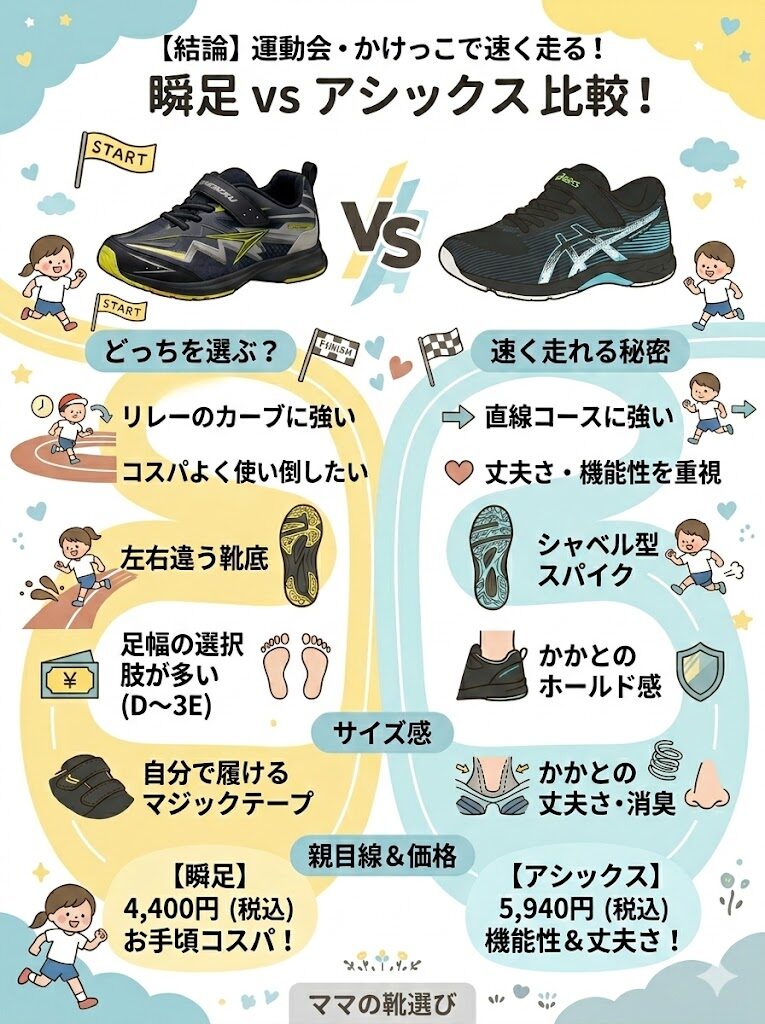 【結論】運動会やかけっこで速く走るなら瞬足とアシックスどっち?